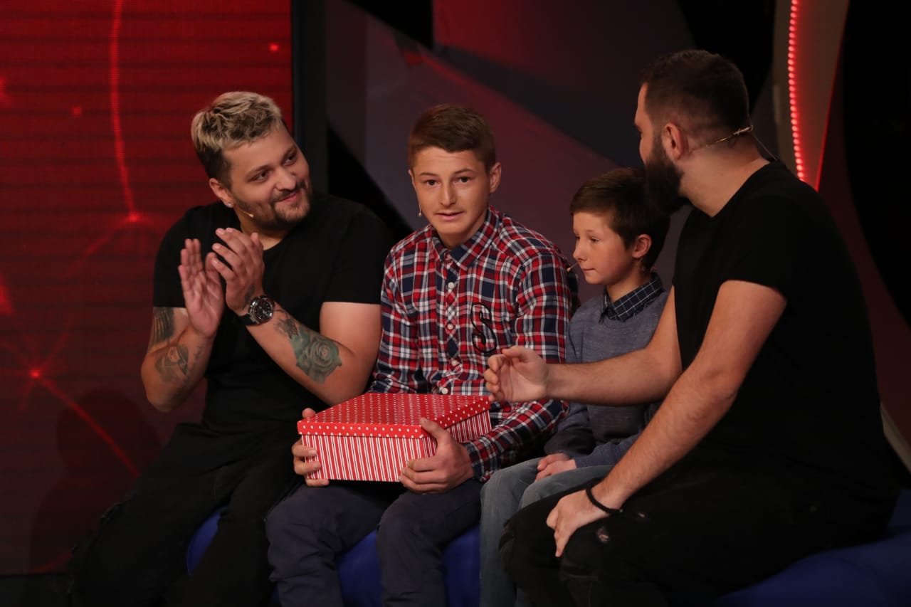 Moderatorja Arbana Osmani për t’i bërë djemtë që të kalonin një moment të paharrueshëm kishte ftuar dy këngëtarët e grupit “Three Dots”, Brunon dhe Klajdin, të cilët ata i pëlqenin shumë. “Ne nuk mundemi të flasim dot nga emocionet e tëpërta që kemi, por Zoti do ju bëjë të fortë. Unë po të dhuroj këtë kuti në të cilën ndodhen bojërat dhe penelat që t’i të ndjekësh ëndrrën tënde, pikturën”, u shpreh Klajdi.