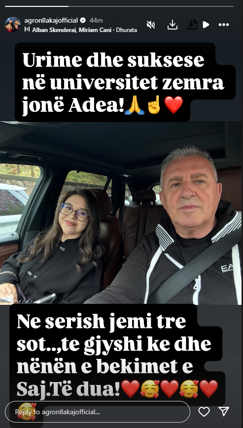 “Urime dhe suksese në universitet zemra jonë Adea! Ne sërish jemi tre sot… te gjyshi ke dhe nënën e bekimet e saj. Të dua!””