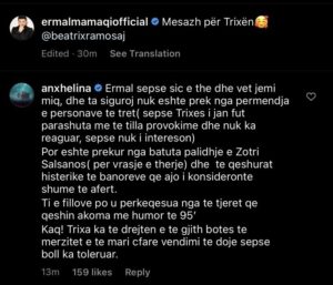 Anxhelina Hadërgjonaj ka shpjeguar para Ermalit dhe gjithë të tjerëve çfarë e bëri Beatrixën të mos shkojë në shtëpinë e BBV sonte. Me një koment në videon ku ai i lutet Trixës të ndryshojë vendimin, Anxhelina ka shkruar: “Ermal sepse siç e the dhe vet jemi miq, dhe ta siguroj nuk eshte prek nga permendja e personave te tretë (sepse Trixes i jane fut parashuta me te tilla provokime dhe nuk ka reaguar, sepse nuk i intereson), por eshte prekur nga batuta palidhje e Zoteri Salsanos (per vrasje e therje) dhe te qeshurat histerike te banoreve qe ajo i konsideronte shume te afert. Ti e fillove po u perkeqesua nga te tjeret qe qeshin akoma me humor te 95′. Kaq! Trixa ka te drejten e te gjithe botes te merzitet e te marre cfare vendimi te doje sepse boll ka toleruar”.