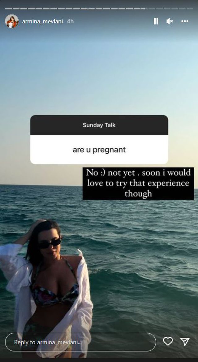Blogerja ka realizuar së fundmi një intervistë virtuale me ndjekësit e saj në Instagram. Një ndjekës e ka pyetur moderatoren nëse është shtatzënë dhe Armina nuk ka ngurruar aspak t’i përgjigjet me sinqeritet ndjekësit.