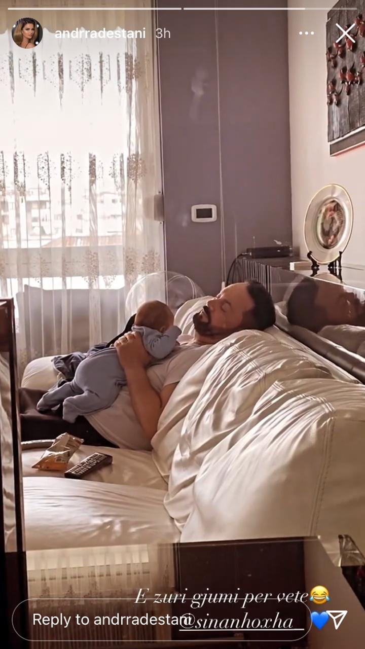 Dhe s’kishte si të mungonte ndryshe edhe kujdesi për fëmijët. Por ditën e sotme, teksa Sinani po qëndronte me të voglin Ayan, i shtrirë në krevat, duket se vogëlushi i ka kënduar një ninullë me belbëzimet e tij. Andrra ka postuar një video teksa Sinanin e ka zënë gjumi me të voglin në krahë.
