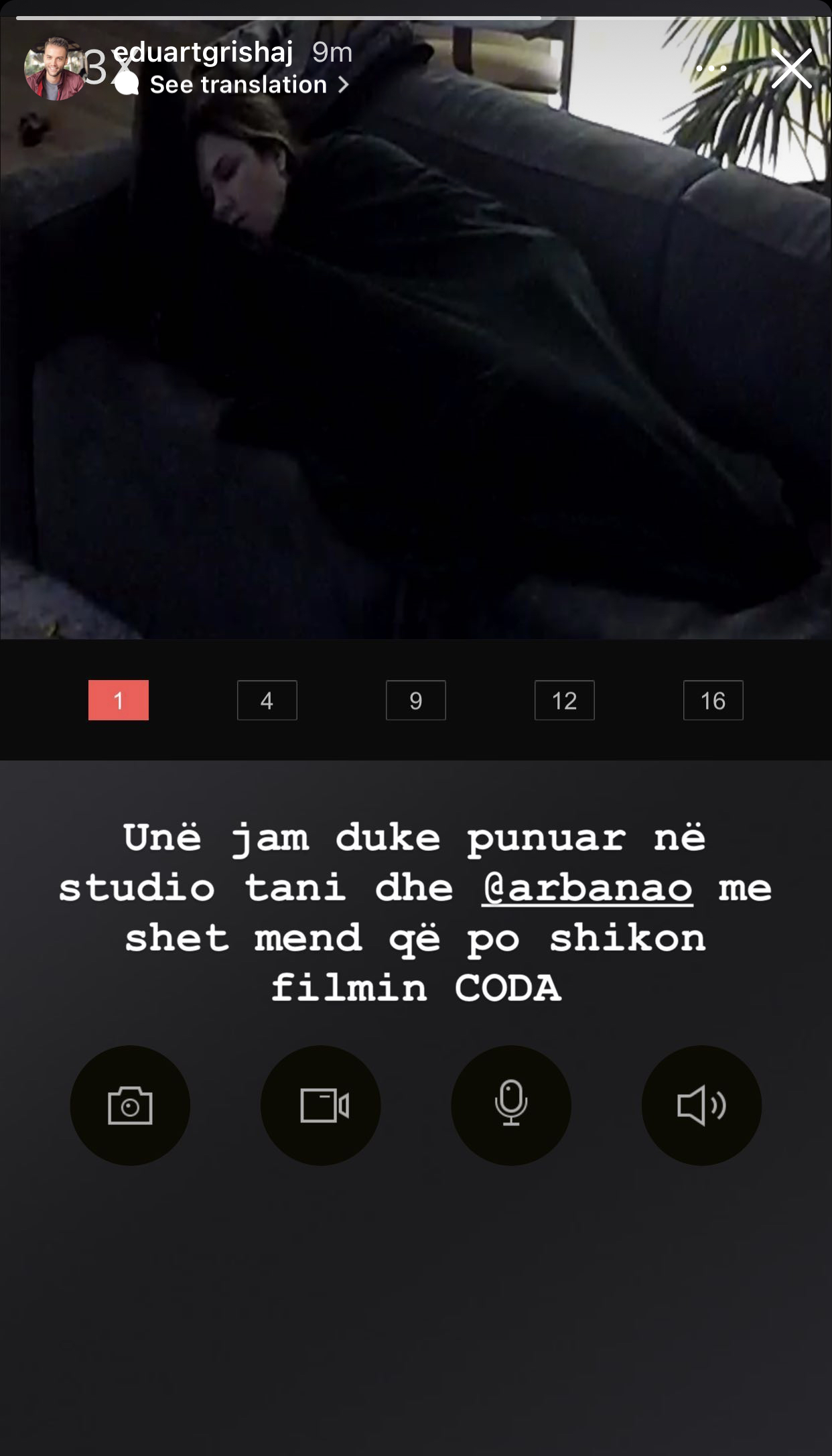“Unë jam duke punuar në studio tani dhe @arbanao më shet mend që po shikon filmin Coda”, ka shkruar Edi krah fotos së Arbanës n shtëpi.