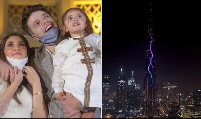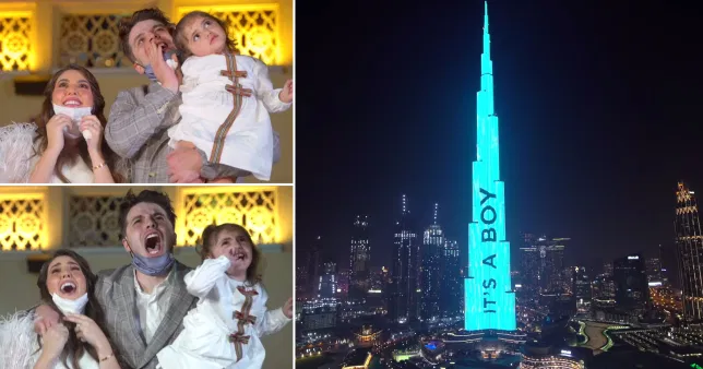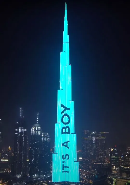 Blogger-ët e Youtube, Anas e Asala Marwah publikuan gjininë e fëmijës së tyre të dytë duke shkruar me drita blu ‘It’s a boy!’ (Është djalë) në gjatësinë e Burj Khalifa në Dubai.