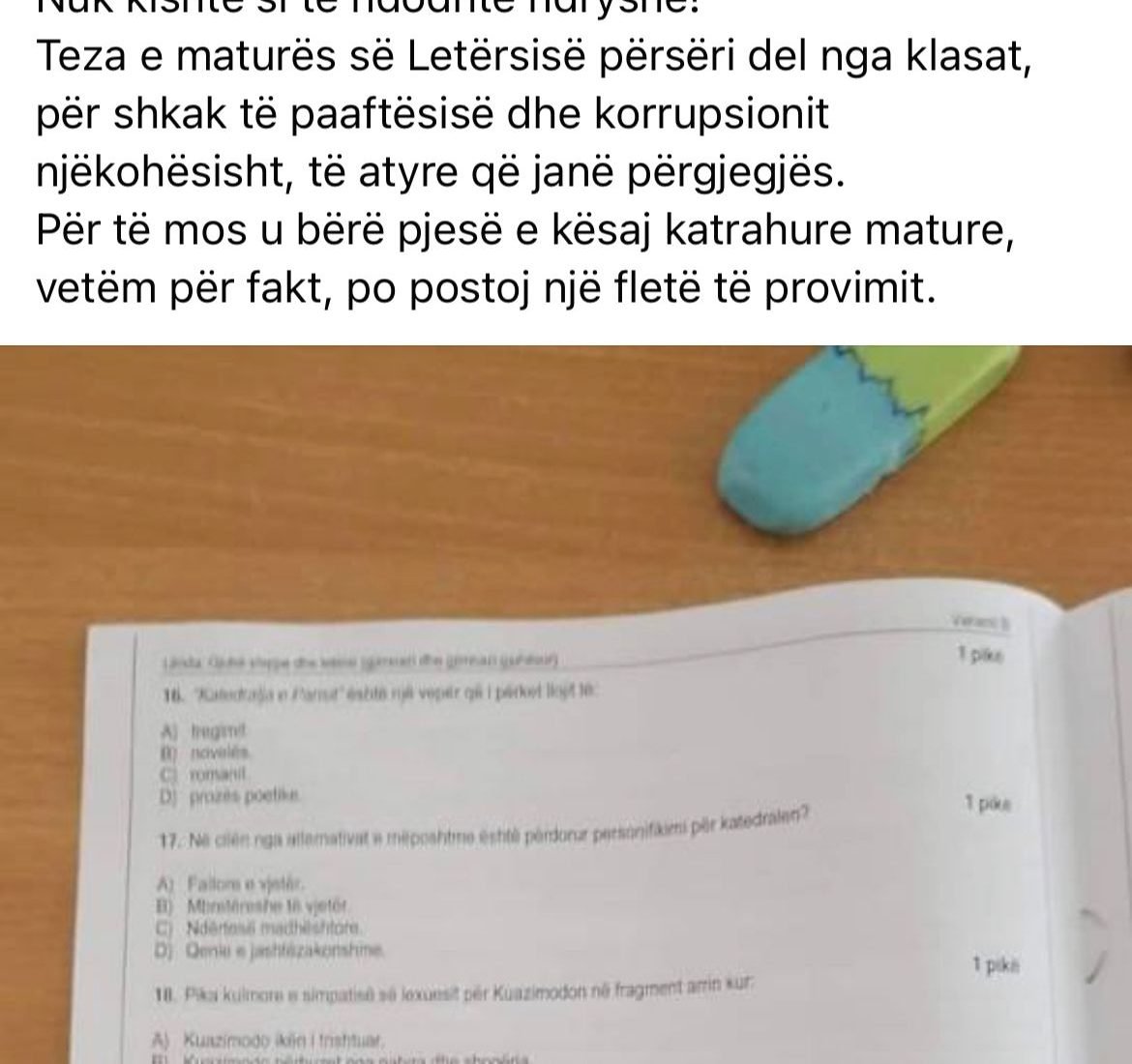 “Sot nga ora 10 00 deri në 12 30 maturantët po japin provimin e letërsisë! Edhe pse është totalisht e ndaluar para 1 ore ka dalë teza e provimit! Ky është arsimi që duam sot në Shqipëri”, shkruan deputeti tjetër demokrat dhe ndan fotot e tezës.