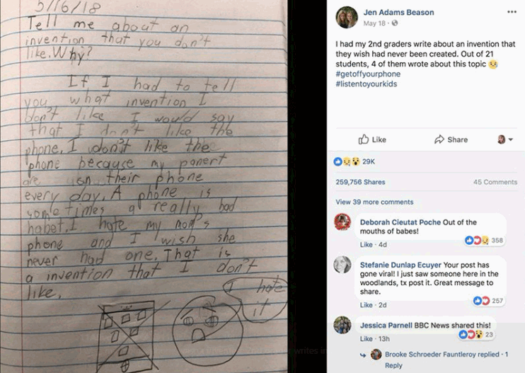 “E urrej telefonin e mamit tim dhe do kisha dashur të mos kishte kurrë një të tillë”, është ajo Çfarë fëmija e një shkolle fillore, shkroi në detyrën e klasës.