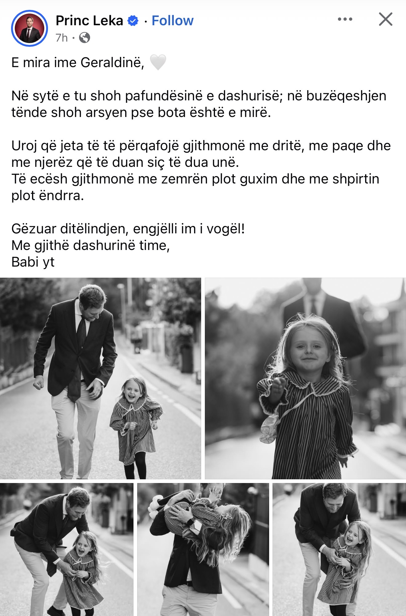 Ditën e sotme, Geraldina vajza e Princ Lekës dhe Elia Zaharias feston ditëlindjen. Leka ka zgjedhur ta urojë me disa foto të tyre ku përbri shkruan;