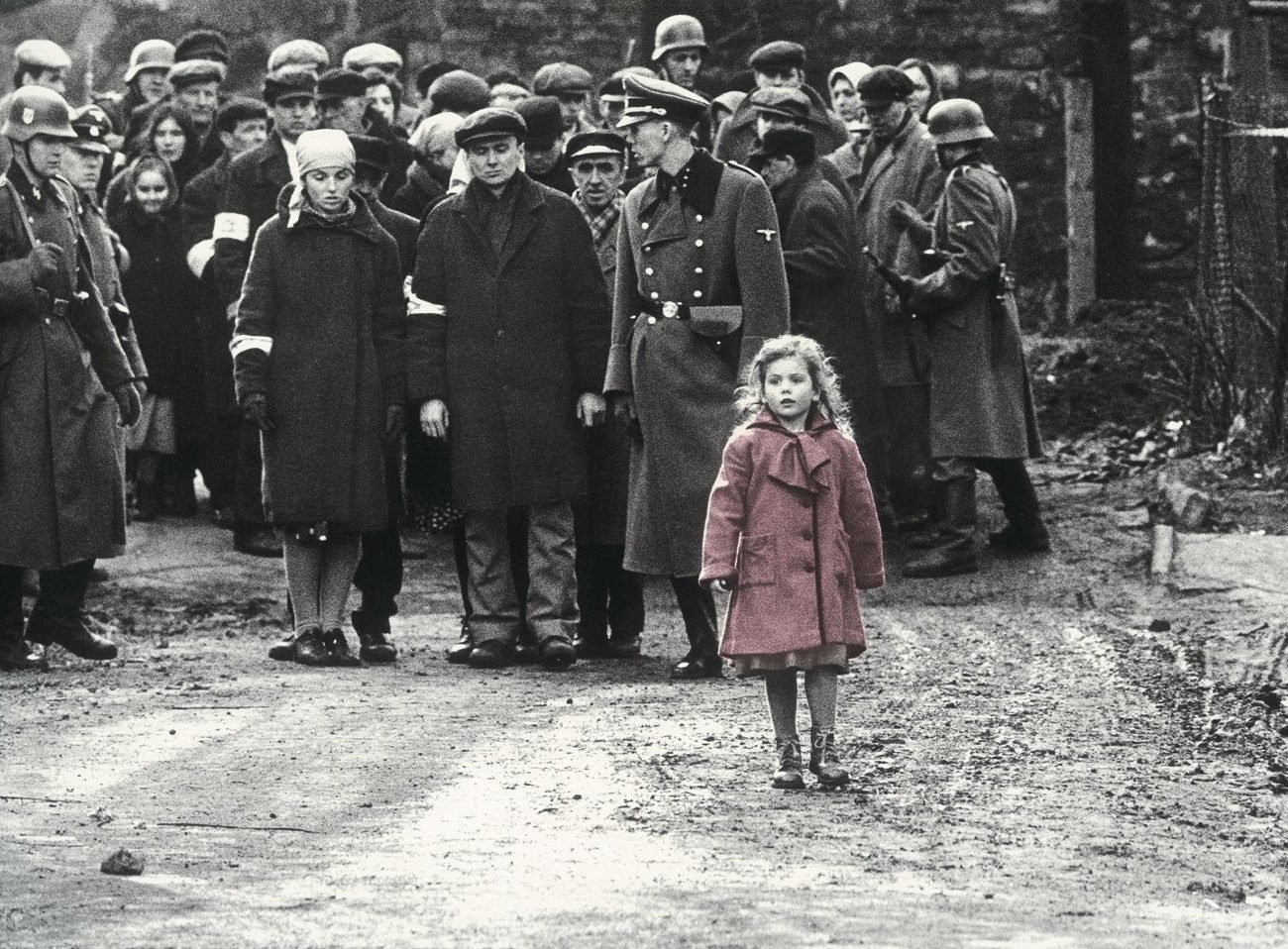 Teksa ecën nëpër rrugët e Krakovës në Poloni, vendndodhja e një prej getove më të mëdha hebreje në Luftën e Dytë Botërore, ajo rrëshqet në heshtje mes skenave të të shtënave masive dhe histerisë. Vajza e vogël tërheq syrin e protagonistit, biznesmenit Oskar Schindler, i cili po shikon skenën nga një kodër sipër. Palltoja e saj e kuqe është një simbol i drejtpërdrejtë i humbjes, pafajësisë dhe vuajtjes hebreje. Ai u bë një nga xhirimet më të paharrueshme të kinemasë.
