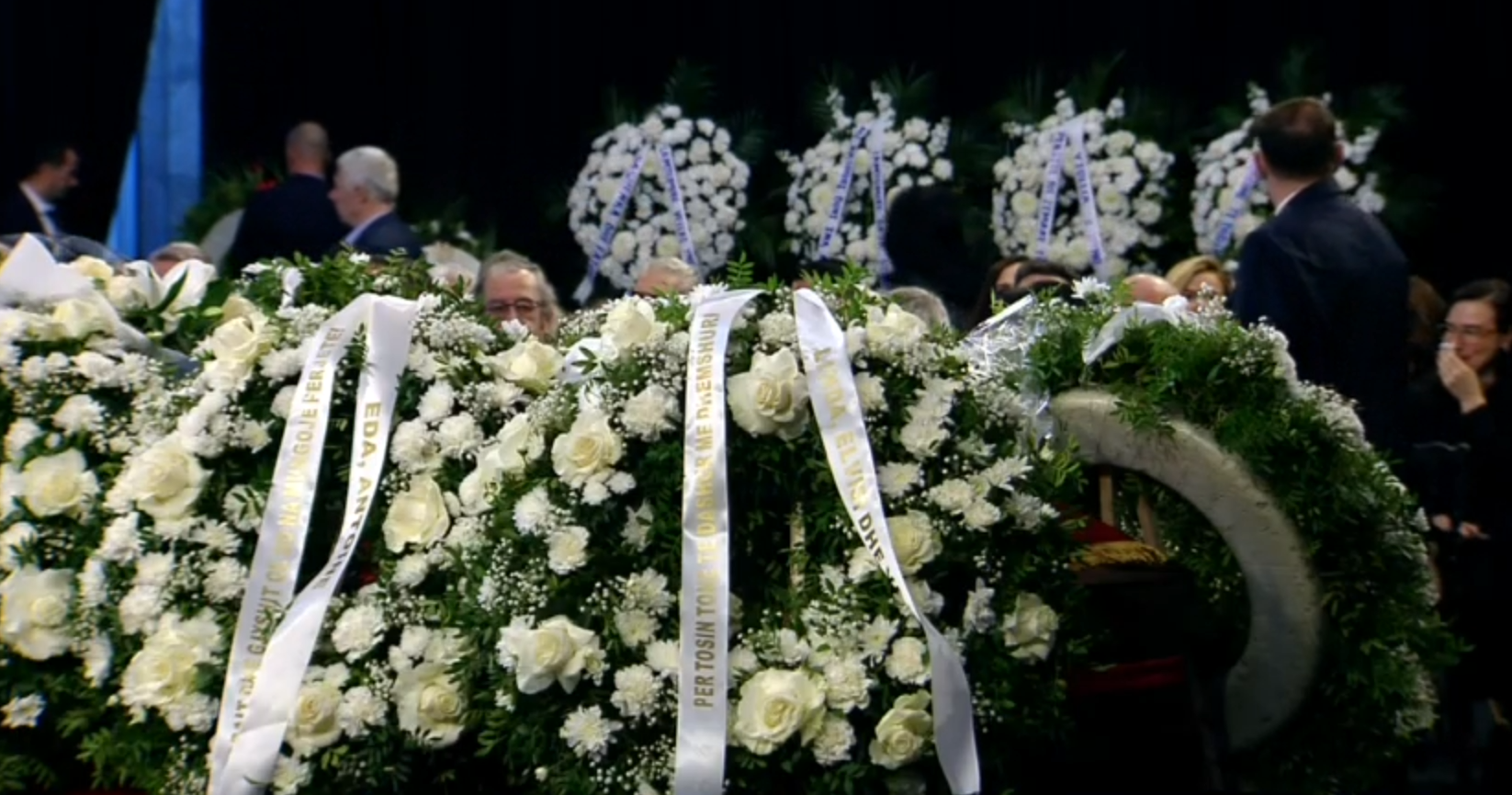 Të pranishëm janë familjarë të Fatos Nanos, mes tyre bashkëshortja e tij, Xhoana Nano, djali Sokoli dhe ish-bashkëshortja Rexhina.