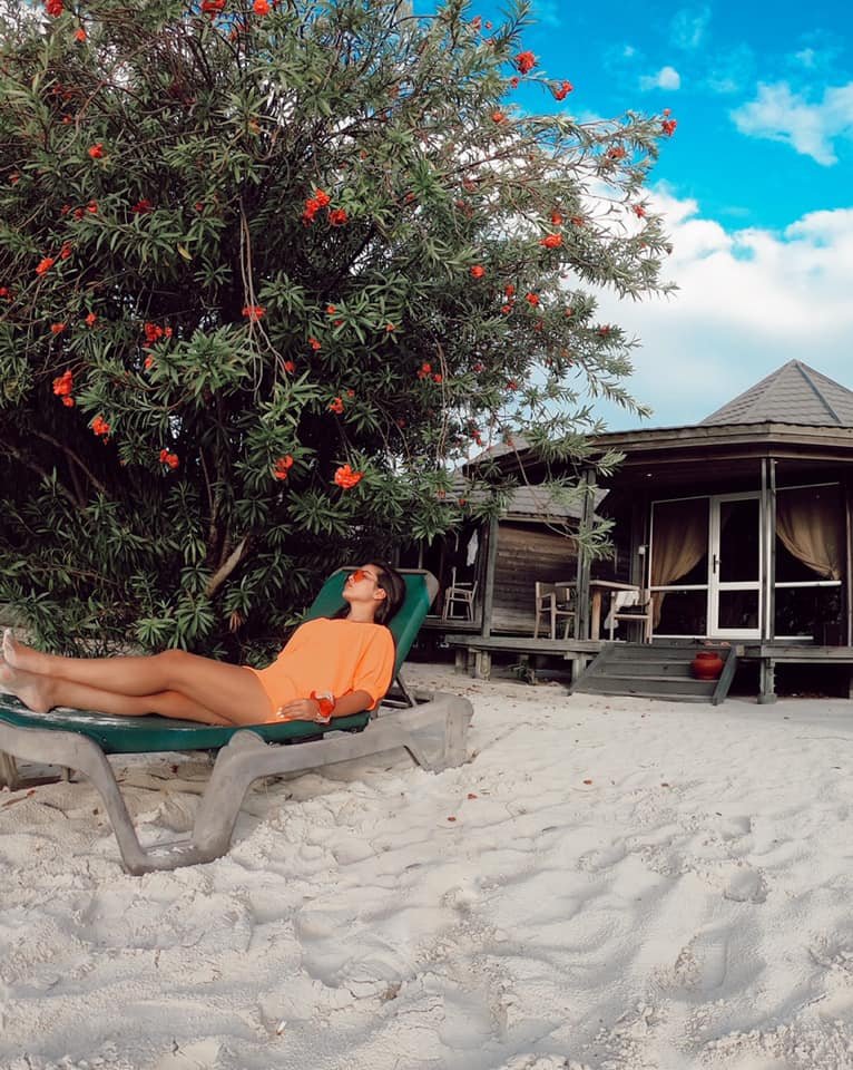 Edhe dje në këtë foto, Elita ishte shtrirë për të marrë rreze dielli, e veshur me bluzë.