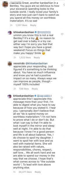 “Unë nuk jam këtu për të provuar se çfarë bëj unë apo nuk bëj. Por unë mund të them se jam e aftë ta shikoj veten time në pasqyrë dhe të fle e qetë natën. Jam e aftë ta bëj këtë gjë, sepse e di që jam një njeri i mirë dhe jeta është e gjitha për balancë. Po, unë zgjedh ta dëmtoj vajzën time. Unë dua ta dëmtoj atë me dashuri dhe po ashtu dhe me gjëra materiale. Ajo do të rritet gjithashtu me vlera, përgjegjësi, detyra, respekt dhe dashuri për veten”, ka thënë ndër të tjera Khloe. Pas kësaj ajo ka marrë mbështetjen e shumë fansave, të cilët thoshin se nuk ka nevojë t’i japë askujt shpjegime për jetën e saj.