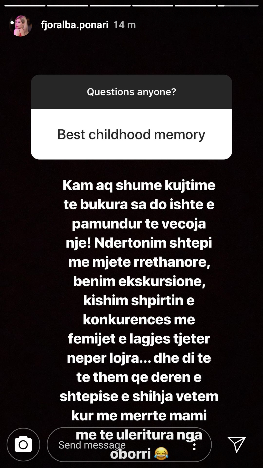 Fjoralba Ponari është një nga moderatoret më të reja të showbiz-it shqiptar. Prej kohësh ajo është pjesë e stafit të ‘E Diell’ në ‘Top Channel’, së bashku me Edi Manushi dhe Ervin Kurti, etj. Kjo ka bërë që Fjoralba të jetë e ndjekur edhe në rrjete sociale, ku herë pas here i kthen përgjigje pyetjeve të fansave të saj. Ditën e sotme, dikush e ka pyetur në lidhje me fëmijërinë e saj dhe kujtimet më të bukura që ka dhe moderatorja nuk ka nguruar aspak t’i ndajë këto momente me ndjekësit e saj. “Kam aq shumë kujtime të bukura sa do ishte e pamundur të veçoja një! Ndërtonim shtëpi me mjete rrethanore, bënim eskursione, kishim shpirtin e konkurencës me fëmijët e lagjes tjetër në lojëra…dhe di të them që derën e shtëpisë e shihja vetëm kur më merrte mami me të ulëritura në oborr”, ka shkruar Fjoralba. Përveç pyetjeve të shumta, ajo ka marrë edhe shumë komplimenta nga dashamirësit e saj.
