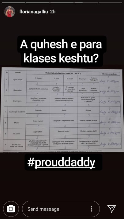 Vogëlushja e ka mbyllur shkëlqyer klasën e parë dhe kjo gjë e ka lumturuar pa masë babi Florin. Moderatori ka publikuar në ‘Instagram’ një fotografi të dëftesës së vajzës, në të cilën shihet se është vlerësuar në të gjitha lëndët me notën 5 ose ndryshe me “Arritje të shkëlqyera”. Përkrah fotos së notave Floriani ka shkruar: “A quhesh e para e klasës kështu? Baba krenar”.