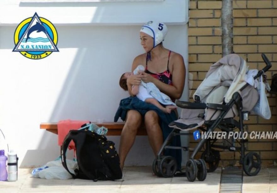 Një sportiste e vaterpolit në Chania zgjodhi të mos linte pas dore dashurinë për sportin dhe as fëmijën e saj. Kështu sportistja Markela Ploumi vendosi të merrte beben e saj të porsalindur dhe të kujdesej për të në momentet e pushimit të ndeshjes.