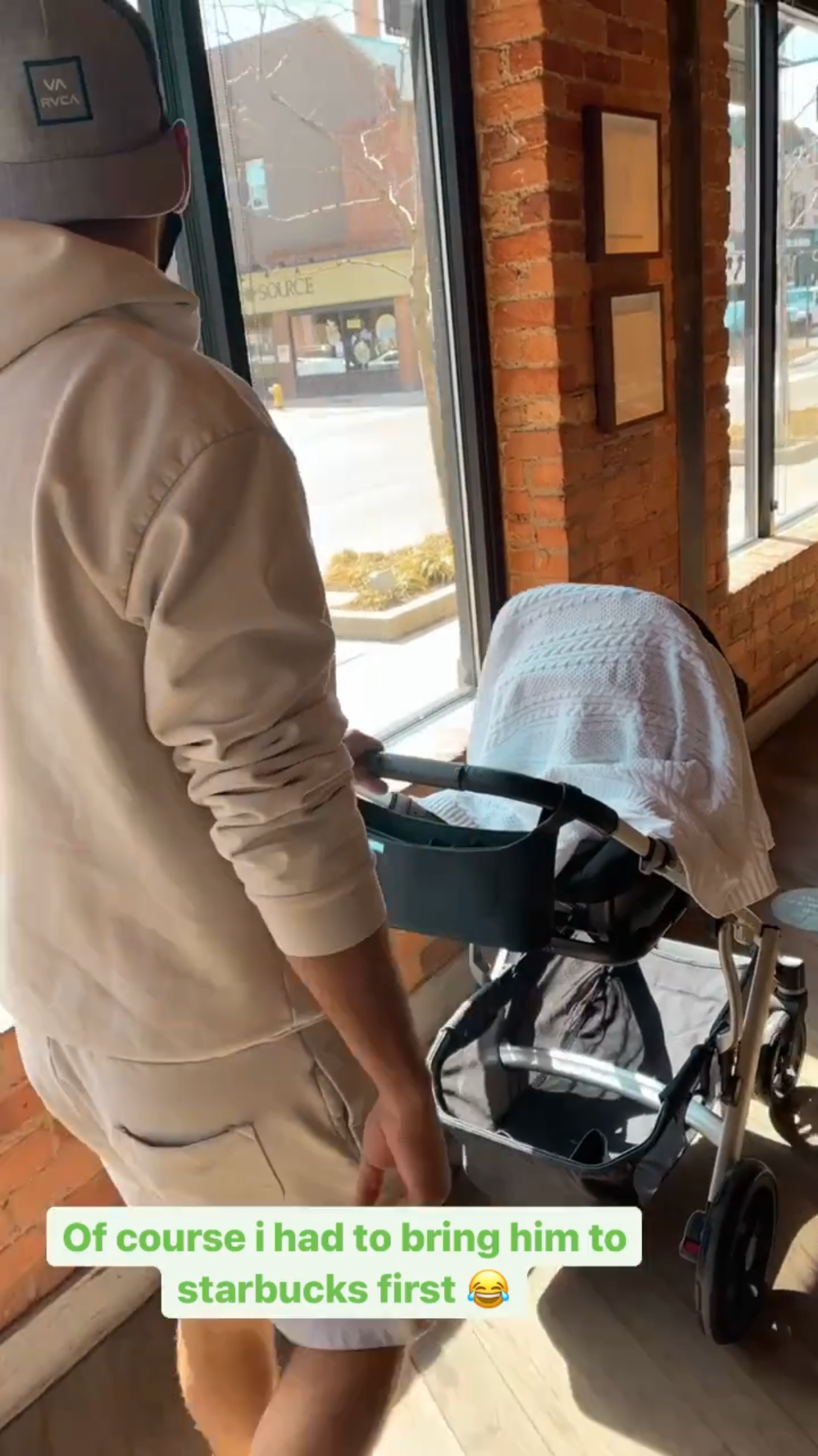 “Sigurisht që do ta sillja në Starbucks fillimisht”- ka shkruar ajo me humor krahas videos ku Jakub shfaqet duke shtyrë karrocën e të voglit, si një baba shembullor.