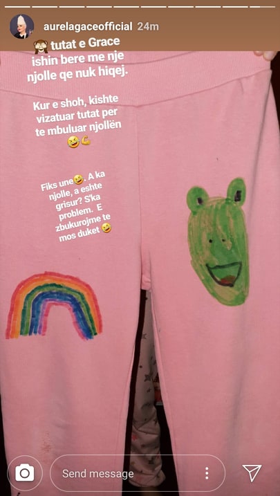 Aurela Gaçe ka treguar shpeshherë se për veshjet e saj dhe grimin në shumicën e rasteve kujdeset vetë. Ajo i përshtat të gjitha veshjet, deri në detajin më të vogël, me stilin e saj dhe gjithmonë ja ka dalë mbanë të duket bukur. Madje Aurela ka zbuluar se gjen gjithmonë një mënyrë për të rregulluar veshjet që janë grisur apo që kanë një problem të vogël dhe këtë truk duket se ja ka mësuar edhe vajzës së saj të madhe. Këngëtarja ka publikuar në ‘Instagram’ një foto në të cilën ka treguar se si Grace ka rregulluar një palë tuta që i ka pasur me njollë. Në pjesën ku tutat janë bërë pis vogëlushja ka vizatuar një bretkosë dhe një ylber për të mbuluar njollat. Aurelës duket se i ka pëlqyer shumë ky veprim i vajzës së saj, ndaj e ka ndarë me ndjekësit në rrjete sociale. “Fiks si unë. A ka njollë? A është grisur? S’ka problem. E zbukurojmë të mos duket”, ka shkruar Aurela bashkangjitur fotos.