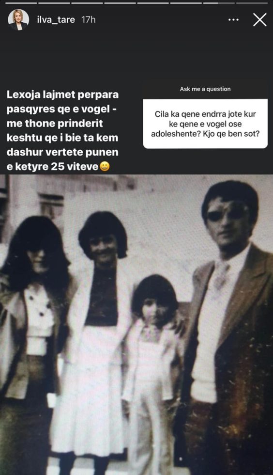 Me disa pyetje në ‘Instastory’, Ilva Tare ka bërë përhshëndetjet e fundit edhe me ndjekësit në rrjetet sociale. E pyetur se cila ka qenë ëndrra e gazetares që prej adoleshencës, Ilva është përgjigjur duke thënë: “Lexoja lajmet përpara pasqyrës që e vogël, më thonë prindërit, kështuqë i bie ta kem dashur vërtetë punën e këtyre 25 viteve”.