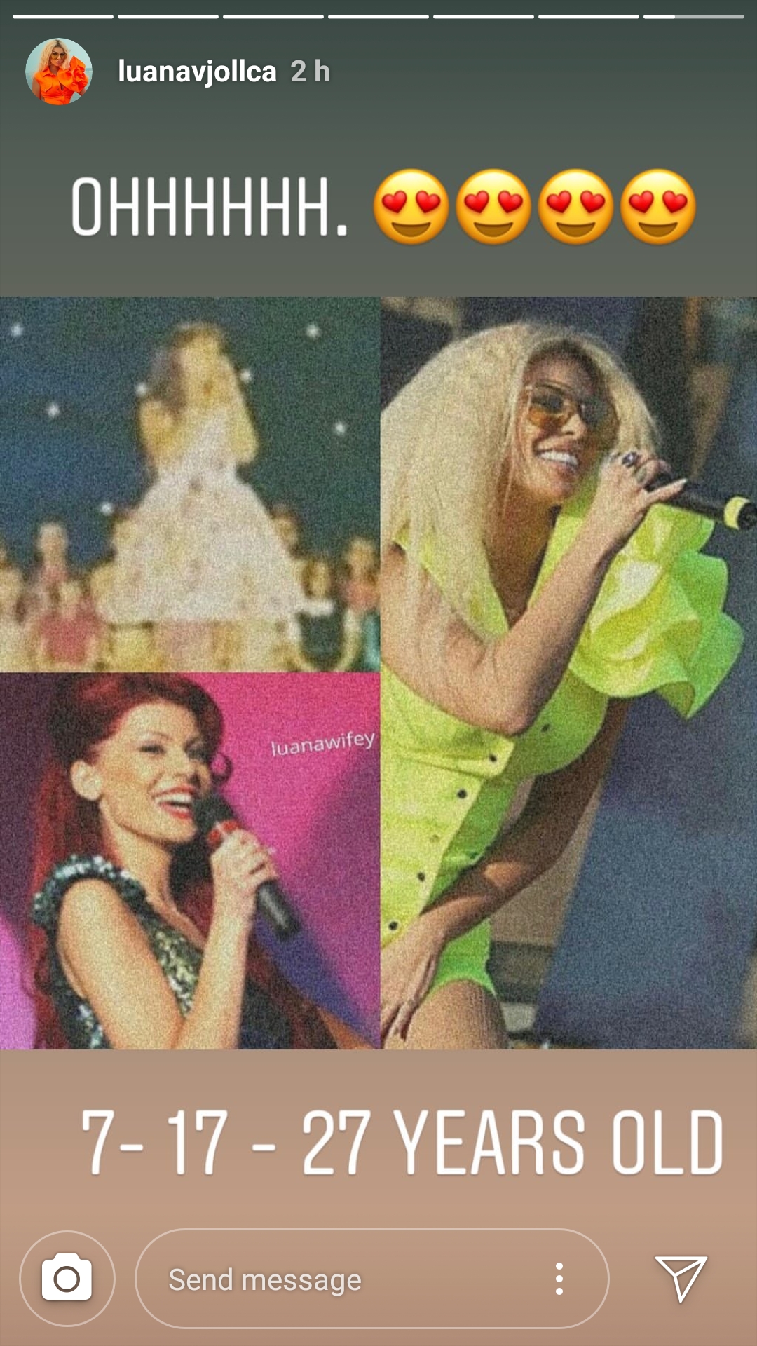 Luana Vjollca është kthyer në një nga këngëtaret më të suksesshme, këngët e së cilës kanë arritur të thyejnë rekorde që në ditët e para të publikimit. Mesa duket, talenti i saj në muzikë është shfaqur që në moshën 7-vjeçare, kur dhe ka mbajtur mikrofonin për herë të parë. Moderatorja ka publikuar një foto në ‘Instastory’ ku ka zbuluar se si dukej ajo në moshën 7-vjeçare, më pas në moshën 17-vjeçare dhe një foto 27-vjeç, të gjitha këto momente të kapura në skenë. Gjatë këtyre 10 apo 20 viteve, Luana ka pësuar ndryshime jo vetëm në pamjen e saj fizike, por edhe në karrierë, pasi suksesi i saj ka ardhur gjithmonë duke u rritur. Kujtojmë se së fundmi, moderatorja solli bashkëpunimin e saj të parë ndërkombëtar me Faydee, një këngë kjo që arriti të merrte 1 milionë klikime në vetëm 8 orë. Momentalisht ajo ka nisur pushimet me njerëzit e saj më të dashur, por me siguri nuk do të zgjasë shumë derisa ajo t’i kthehet punës.