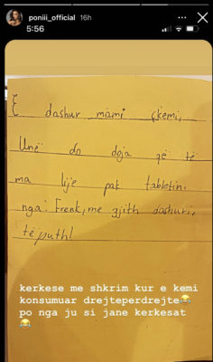 Nëse keni qenë kuriozë të dini pak më shumë mbi raportin e Ponit me të birin, Frenk, kjo foto e publikuar nga vetë ajo, tregon gjithçka. Këngëtarja ka postuar një letër të shkruar nga i biri, i cili ka ngritur një kërkesë me shkrim që mami t’i japë tabletin. Mes rreshtaash ai ka kërkuar leje dhe letrën e mbyll me fjalët: “Nga Frenk, me gjithë dashurinë. Të puth”.