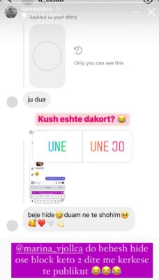 “Marina do bëhesh hide ose block këto dy ditë me kërkesë të publikut”, i ka shkruar Luana me të qeshur motrës së saj, duke rënë dakord me kërkesën e ndjekësve për t’i ndarë fotot.