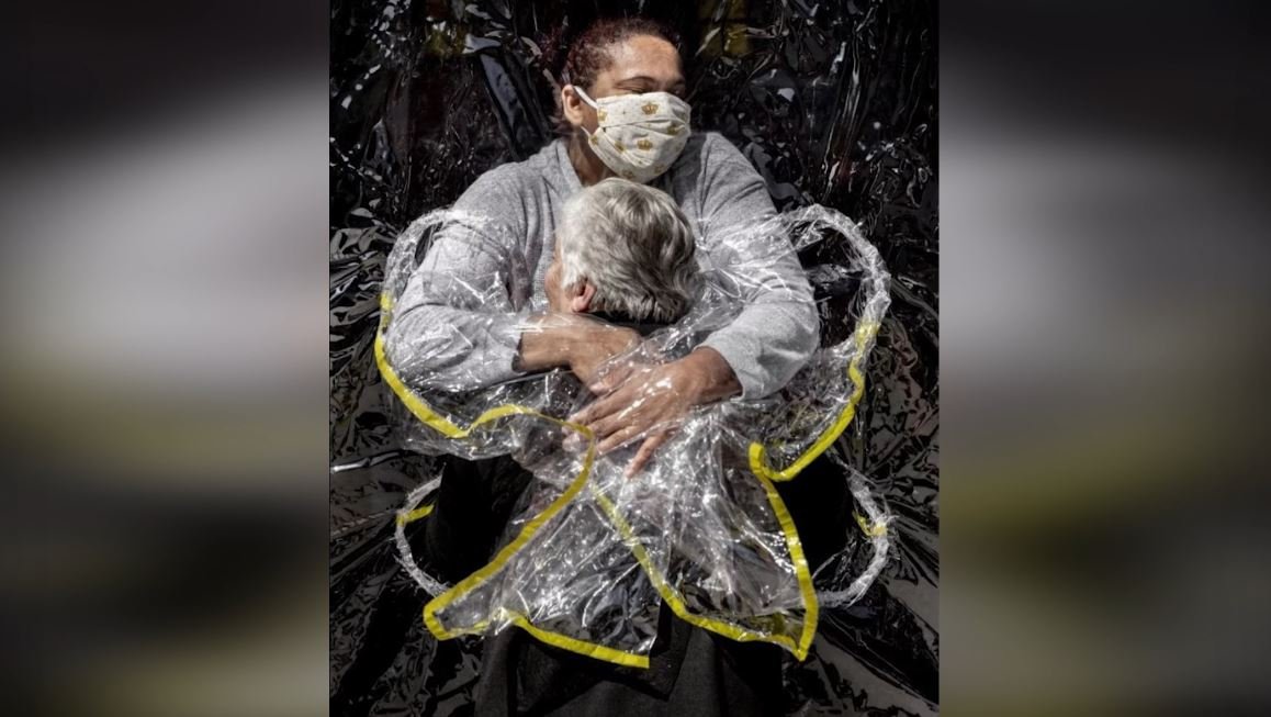 Fotografia fituese, e quajtur “Përqafimi i parë”, tregon brazilianen Rosa Luzia Lunardi, 85 vjeç, ndërsa infermierja Adriana Silva da Costa Souza e përqafon atë në një azil pleqsh më 5 Gusht 2020.