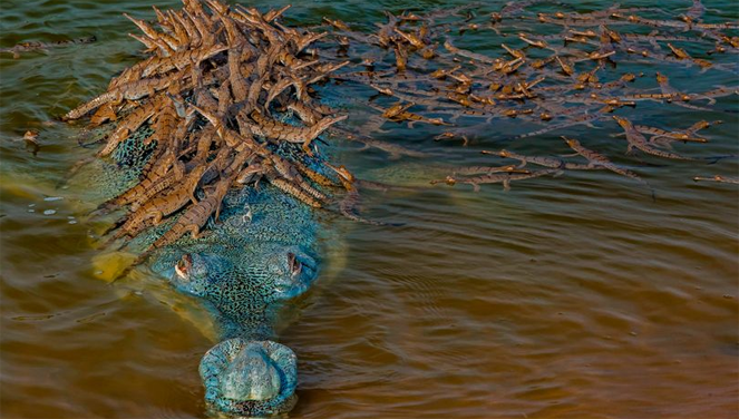 Krokodili i rrallë mban 100 bebe në kurriz pas çiftimit me 7-8 femra