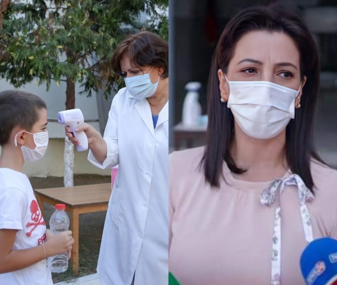 Tani ne do të shkojmë tek djali në fund që nuk ka maskë. Ku e ke maskën? Nuk duhet të rrish në klasë pa maskë, sepse mund ta marrësh virusin dhe mund t’ia çosh mamit, babit apo gjyshes. Kështu që nuk duhet asnjë moment pa maskë. Kështu që ma jep dorën.
