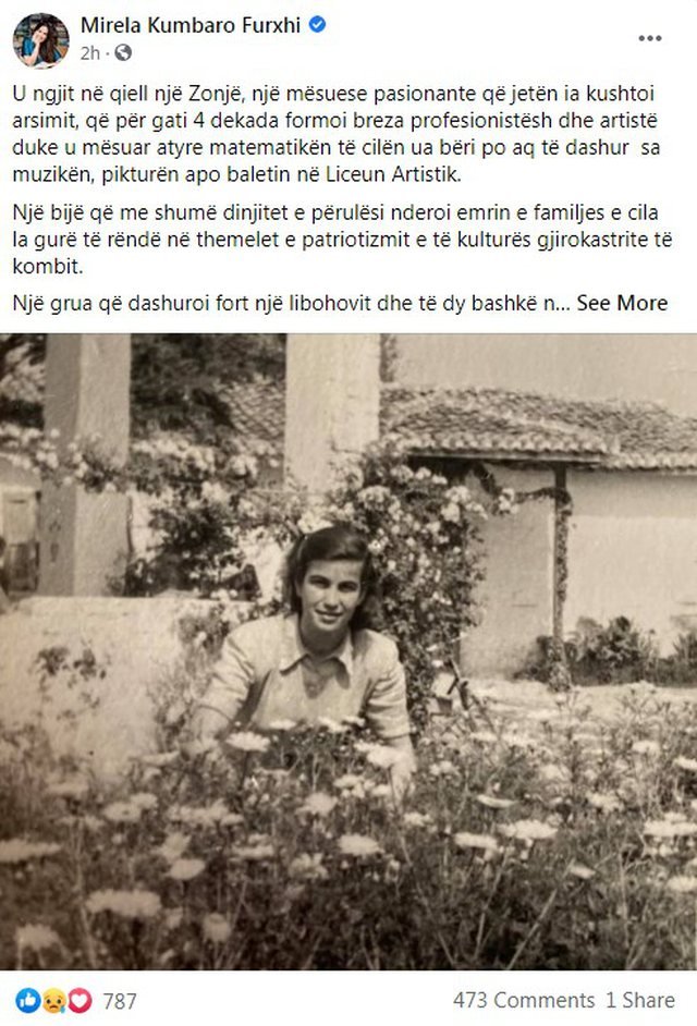 “U ngjit në qiell një Zonjë, një mësuese pasionante që jetën ia kushtoi arsimit, që për gati 4 dekada formoi breza profesionistësh dhe artistë duke u mësuar atyre matematikën të cilën ua bëri po aq të dashur sa muzikën, pikturën apo baletin në Liceun Artistik.