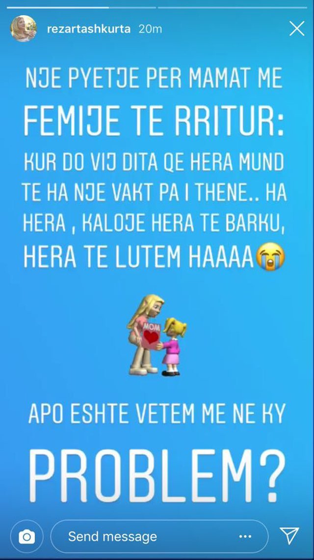 “Një pyetje për mamat me fëmijë të rritur: Kur do vijë dita që Hera mund të ha një vakt pa i thënë… Ha Hera, kaloje Hera te barku, Hera të lutem haaa…”, shkruan Rezarta në story-n e saj në Instagram.