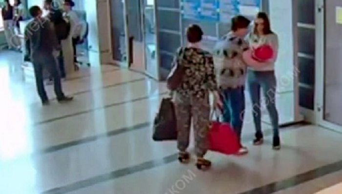 Në video, shihet Inna Petrova e cila është shumë e shqetësuar duke shtrënguar vajzën e saj nëntë ditëshe në aeroportin Omsk në Rusi.