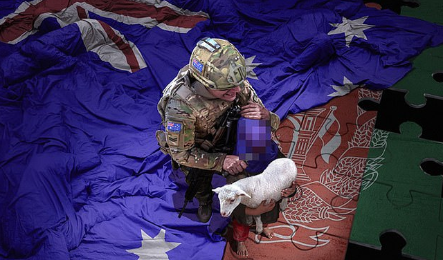 Foto që bëri xhiron e botës tregon një ushtar të buzëqeshur me uniform të ulur mbi një flamur australian dhe mban të ulur një fëmijë afgan nën kërcënimin e thikës.
