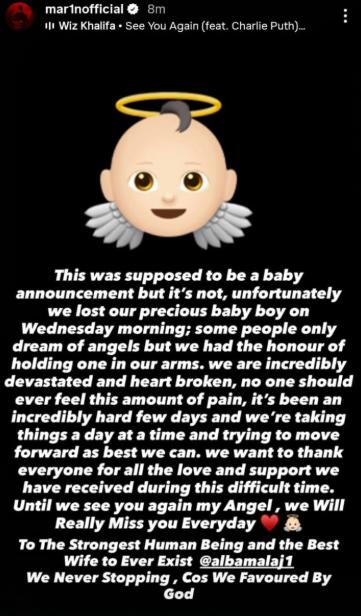 Në postimin e tij, Marin shprehet se kjo ishte menduar të ishte një lajm i gëzueshëm për ardhjen në jetë të vogëlushit, por fatkeqësisht jeta ka marrë një kthesë të dhimbshme për familjen e tij.