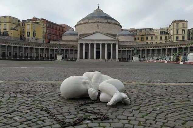 Një fëmijë i shtrirë në krah, një pozicion fetal, me një zinxhir që, simboli i kordonit ombelikal, është ankoruar në dysheme: “Shikoni poshtë”, skulptura e re nga Iago, një artist i njohur i Frosinone, i cili u shfaq këtë natë në qendra e “Piazza Plebiscito”, në zemër të Napolit.