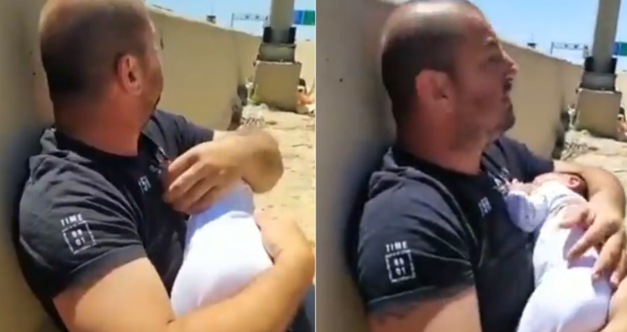 Në mediat sociale është postuar videoja e një babai në Izrael që mundohet të mbrojë foshnjën me turp ndërsa në qyteti sulmohet nga raketa.