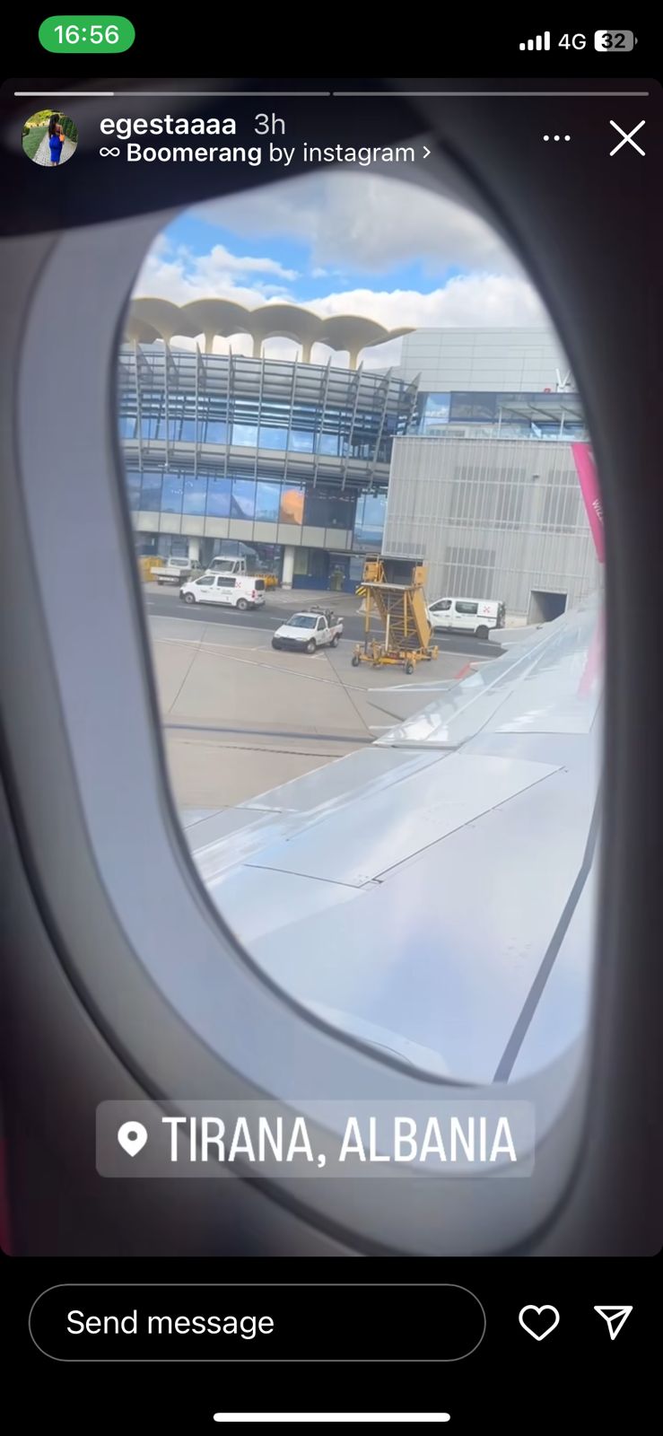 Në një postim para pak orësh në Instastory ajo ka nxjerrë një foto në aeroplan nga ku shihet aeroporti i Tiranës “Nënë Tereza”.