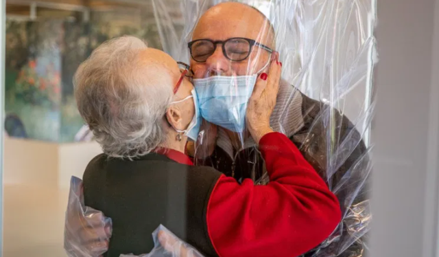 Në Valencia të Spanjës, një shtëpi pensionistësh ka ngritur një “dhomë përqafimi”, një zonë me të gjitha masat mbrojtëse, ku anëtarët e familjes që vizitojnë të dashurit e tyre çdo ditë mund t’i përqafojnë ata të sigurt me një veshje plastike, për të shmangur mundësinë e infektimit me Covid-19 të të moshuarve.