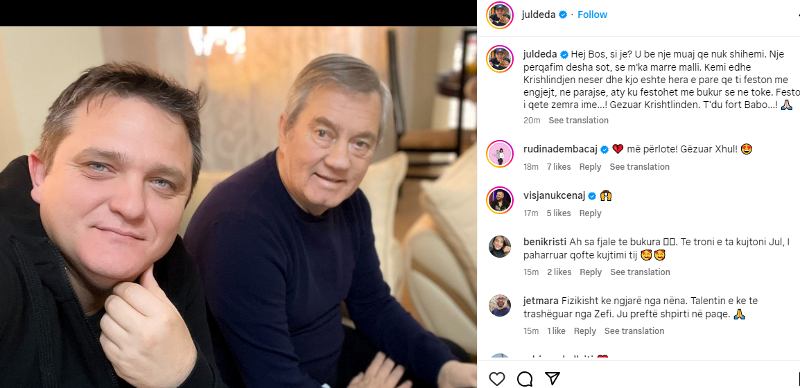 “Hej Bos, si je? U bë një muaj që nuk shihemi. Një përqafim desha sot, se m’ka marrë malli. Kemi edhe Krishtlindjen nesër dhe kjo është hera e parë që ti feston me engjëjt, në parajsë, aty ku festohet më bukur se në tokë. Festo i qetë zemra ime…! Gëzuar Krishtlindjen. T’du fort Babo…! ????????”, ka shkruar Julian Deda.
