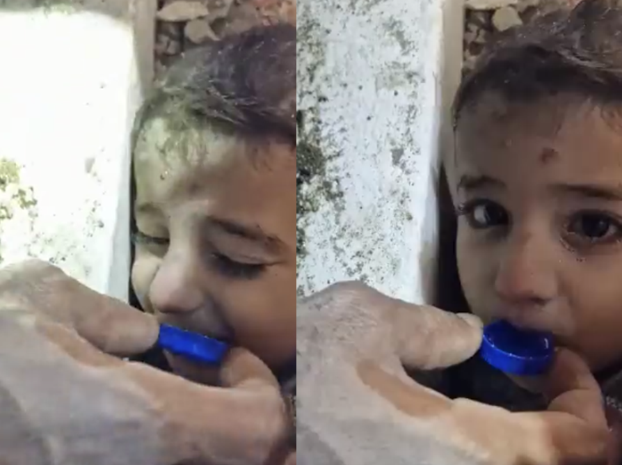 Anëtarët e ekipit të shpëtimit i dhanë ujë vogëlushit me kapakun e shishes, ndërkohë në video shihet teksa i vogli buzëqesh pasi piu ujë.