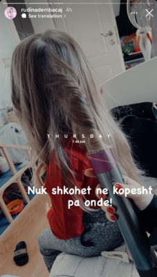 “Nuk shkohet në kopësht pa onde!”, ka shkruar Rudina krah fotos ku duket se po i rregullon flokët të bijës.