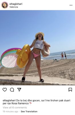 “Do ta bëj dhe gocën, sa të më lirohen pak duart për një Rosa flamenco”, ka shkruar aktorja në foton ku duket se duart i ka të zëna nga orenditë e plazhit për Amar.