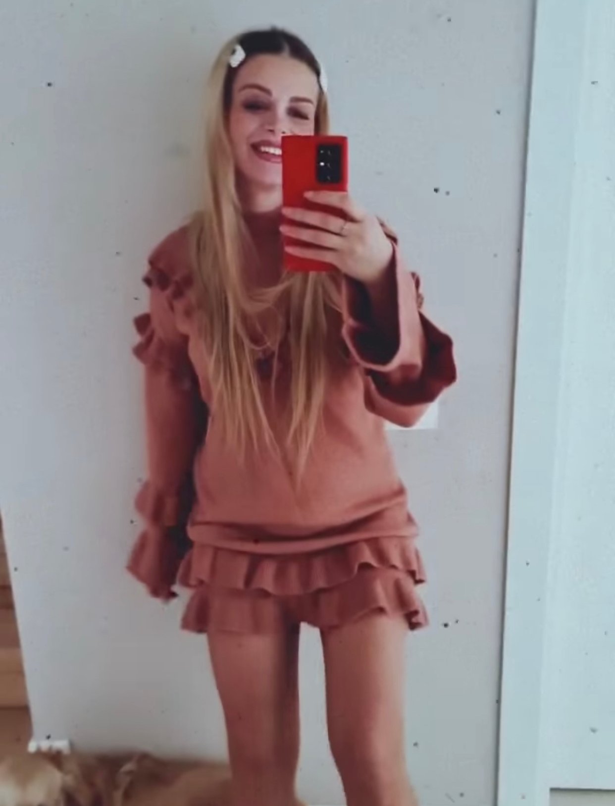 Huta shfaqet e veshur me një fustan të shkurtër rozë dhe barku i rrumbullakosur mund të dallohet lehtësisht, duke pasur parasysh se moderatorja ka një bark të sheshtë për shkak të stërvitjes.