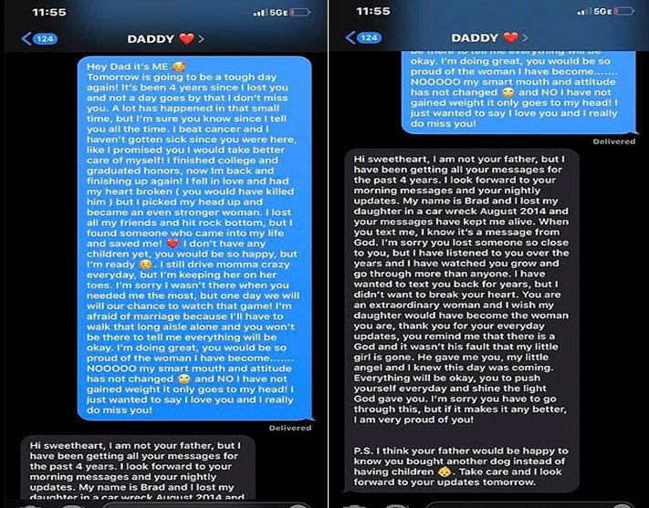 Një vajzë nga Akransas, SHBA, e cila humbi babain e saj 4 vjet më parë, por i dërgonte atij mesazh çdo ditë në telefon për të ndarë me të përditshmërinë e saj, pësoi tronditjen e jetën kur një ditë mori përgjigje nga një burrë i cili kishte humbur vajzën e tij në një aksident me makinë.