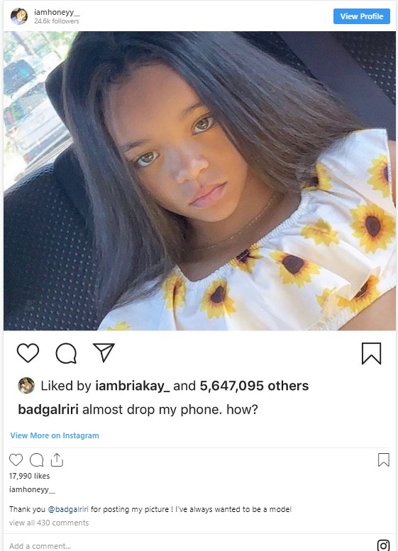 Ditën e djeshme, ylli i muzikës pop, Rihanna publikoi në llogarinë e saj në ‘Instagram’ një foto të një vajze të vogël të quajtur Honey e cila dukej se ishte një kopje e këngëtares. Me flokët e zinj, sytë ngjyrë jeshil, fytyrën e mprehtë vajza dukej si një kopje e artistes kur ka qenë në moshë të vogël.