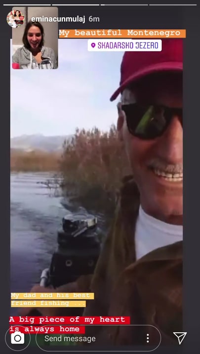 Emina Çunmulaj prej vitesh jeton në SHBA, vend në të cilin ka ndërtuar edhe familjen e saj. Pavarësisht se është larguar në një moshë shumë të vogël nga vendlindja e saj, ajo nuk i ka harruar asnjëherë traditat e kulturën shqiptare. Herë pas here ish-modelja rikthehet në shtëpinë e saj për të vizituar njerëzit e afërt, por edhe kur nuk mundet ta bëjë këtë gjë mjaftohet me një bisedë përmes telefonit. Ditën e sotme Emina ka treguar se mëngjesin e ka nisur në mënyrën më të bukur, duke folur në ‘FaceTime’ me babain e saj dhe një mik të tij. Ajo ka publikuar në ‘Instagram’ një video në të cilën shihet i ati duke peshkuar gjatë kohë që edhe komunikon me të. “Mali i Zi i bukur. Babai im dhe shoku i tij më i mirë duke peshkuar. Një pjesë e madhe e zemrës sime është gjithmonë në shtëpi”, ka shkruar Emina përkrah videos.