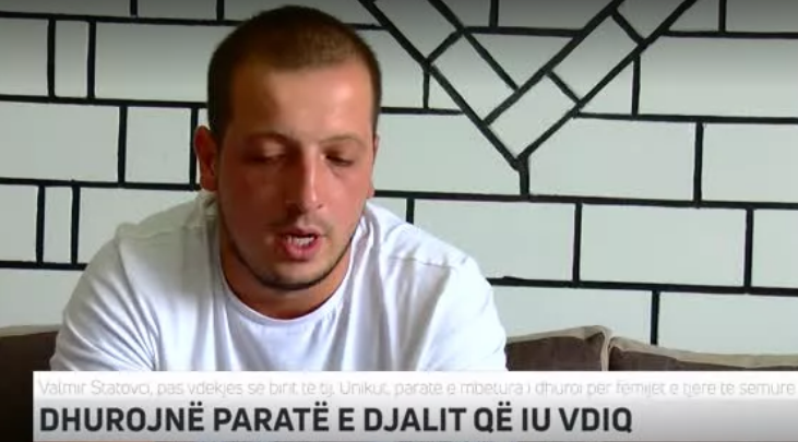 Teksa merret në intervistë nga mediat e Kosovës, Valmiri mban në dorë letrën në të cilën tregon se një fëmije i ka dhuruar 10 mijë euro për kurim.