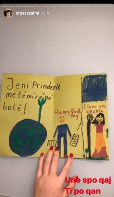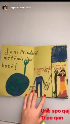 Ajo është nënë e dy fëmijëve, Borës dhe Kronit e së fundmi ka publikuar në ‘Instagram’, gjestin e bukur që ka marrë prej tyre, një kartolinë mjaft të veçantë. “Unë nuk po qaj, ti po qan”, shkruan Orgesa duke treguar kështu se dhurata e tyre ka qenë shumë emocionuese jo vetëm për të, por edhe për ndjekësit e saj.