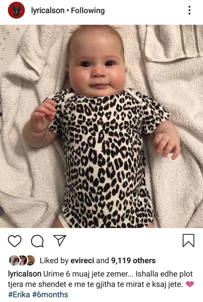 Në 26 janar Lyrical Son u bë baba për herë të dytë, duke u bekuar me një tjetër vajzë. Që nga lindja e vogëlushes së quajtur Erika kanë kaluar 6 muaj dhe sot reperi i ka dedikuara saj disa fjalë shumë emocionuese. Lyrical Son ka publikuar në ‘Instagram’ foton më të ëmbël të vajzës dhe përkrah saj ka shkruar: “Urime 6 muaj jetë zemër… Ishalla edhe plot të tjera me shëndet e me të gjitha të mirat e kësaj jete”.