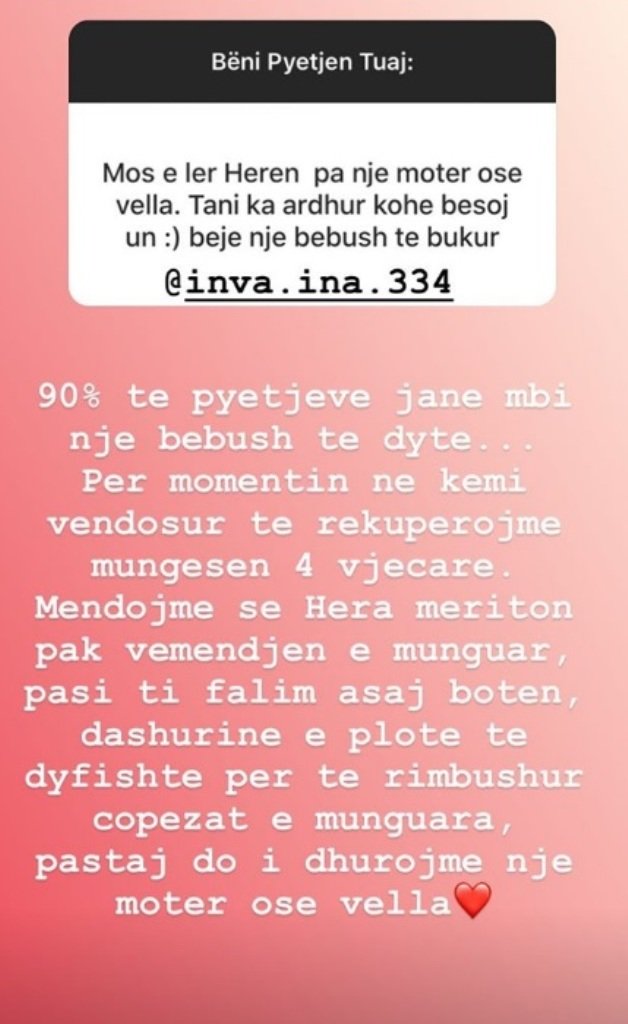 “90% e pyetjeve janë mbi një bebush të dytë. Për momentin ne kemi vendosur që të rikuperojmë mungesën 4-vjeçare. Mendojmë se Hera meriton pak vëmendjen e munguar, pasi ti falim asaj botën, dashurinë e plotë të dyfishtë për të rimbushur copëzat e munguara, pastaj do i dhurojmë një motër ose vëlla”, shkruan këngëtarja.