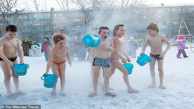 Fëmijët e një shkolle në Siberi, vishen në rroba banjo dhe i vërsulen ujërave të ngrira duke u larë me kovat e mbushura me ujë të ftohtë.