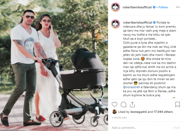 Në muajin gusht Robert Berisha konfirmoi publikisht ndarjen nga Nora Istrefi përmes një postimi në rrjete sociale. Ai u shpreh se kur dashuria mbaron është mirë që një çift të ndahen dhe se Norën do e respektojë gjithmonë si nënën e vajzës së tij. “Noriq të kam borxh gjithë jetën. Të uroj më të mirat”, e mbylli Roberti deklaratën e ndarjes, duke treguar se ai dhe këngëtarja do vazhdojnë të ruajnë raporte të mira.