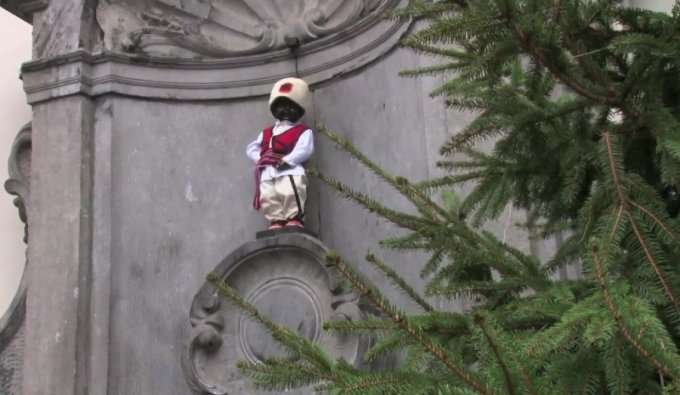 Statuja e Manneken-Pis shihet e veshur me rroba tradicionale shqiptare ndërsa në kokë ka të vënë një plis.